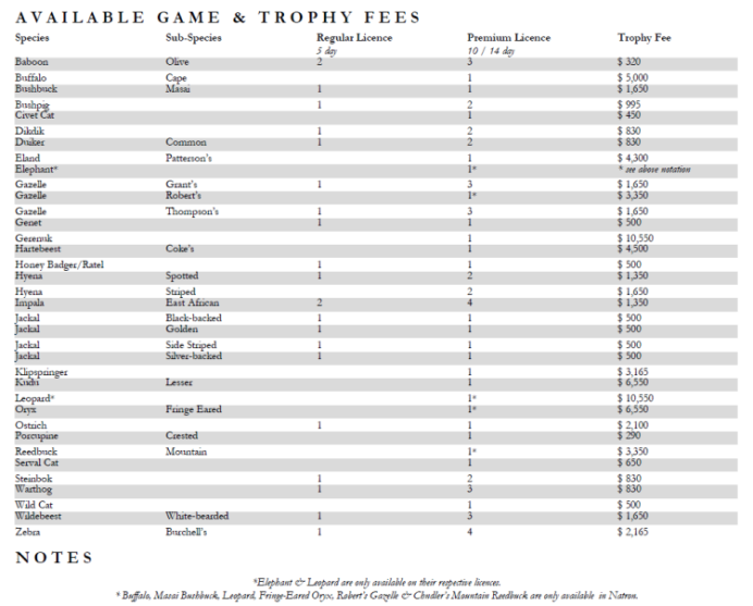 In this concession there are good populations of all the special Masailand game species. In addition, the area has huge leopards, strong buffalo and finally a really good and varied bird hunt.