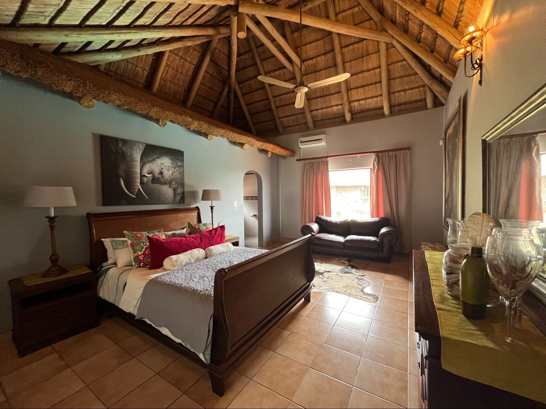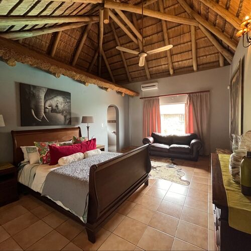 The lodge consist of 3 thatched huts (on for 4 persons and two for 2 persons) and 2 en-suite bedrooms (for 2 persons) - all with en-suite bathrooms. This provides accommodation for five couples or family- and hunting groups at any given time. In additions hunter’s partners are allowed to accompany them on their hunting excursions.