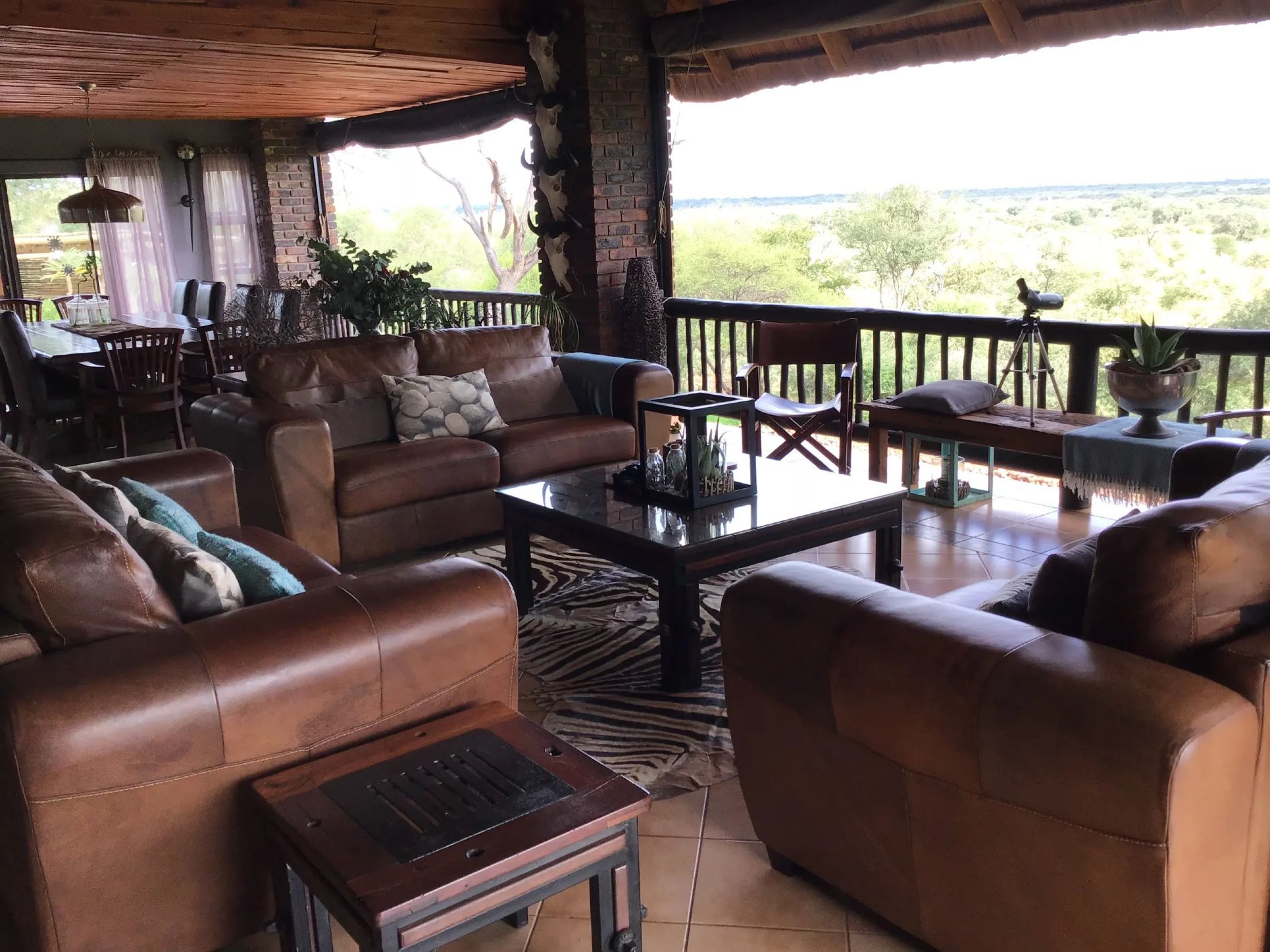 The main lodge has an open veranda and dining area with views over the surrounding valleys. Here you will be spoiled with delicious meals and have plenty of space to relax in. It is also here you will find coffee, tea and snacks plus a minibar with water, soft drinks, wine and beer.