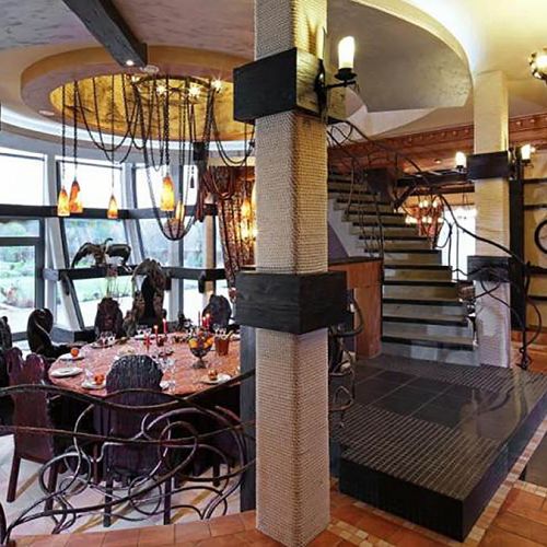 «Hunting Lodge» has four guest rooms. Each one has an individual design and a private bathroom. They are connected by a lounge area and a library. Spacious dining room has a round table enough for 12 people. Piano and karaoke are in the fireplace room. Movie room boasts an interactive shooting range as well as a wide selection of movies. Hunting lodge has internet and WI-FI connection. Green terrace serves as an outdoor dining area.