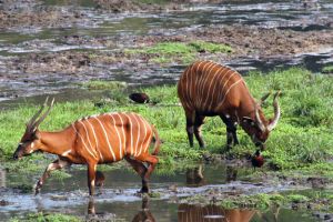 Scientific Name: Tragelaphus eurycerus Subspecies: Eastern Bongo (Tragelaphus e isaaci) Distribution: Western Bongo: Liberia, Sierra Leone, Ivory Coast, Congo (Brassaville), Congo, Cameroun and CAR. Eastern Bongo: Kenya Habitat: Dense rainforest. Often in the vicinity of water. If there happen to be saltlick in the area they are often found near by. Description: Large and heavy anthelope...