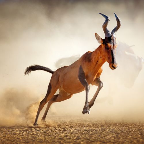 Scientific Name: Alcelaphus b caama Subspecies: Is itself a subspecies of Alcelaphus buselaphus. Distribution: South Africa, Namibia, Botswana and Angola Habitat: Open grassland and savanna. Description: Middlesized antelope, that weighs around 170 kg and measures 120 - 140 cm over the shoulder. General colour light reddish brown. The horns are black and heavy, curved at first slightly...