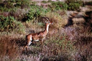 Scientific Name: Littocranius Walleri Subspecies: Litocranius w. sclateri Distribution: Uganda, Somalia, Ethiopia, Tanzania and Kenya. Habitat: Dry thorn-bush country with trees, and even desert. Description: A large gazelle, with an exceptionally long neck (hence its common name: Giraf-gazelle). General colour ruddy brown with the upper back distinctly darker, contrasting with lighter sides....