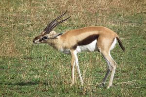 Scientific Name: Gazella thomsoni Subspecies: Gazella th. albonotata Distribution: Northern Tanzania and Kenya. Habitat: Grasslands and open plains, avoiding dense bush and long grass. Description: Small gazelle with a shoulder height of 70 cm and a weight of 20 - 30 kg. General colour deep sandy fawn, broad and sharply defined black lateral band in direct contrast with white underparts. The...