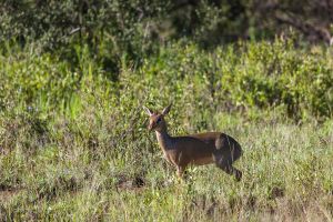 Scientific Name: Raphicerus campestris Subspecies: Authors dissagree on the number of subspecies, and 1 to 8 subspecies are more or less recognized. Distribution: South Africa, Namibia, Angola, Botswana, Zimbabwe, Zambia, Mozambique, Kenya and Tanzania. Habitat: Open plains with bush and very little woodland. Description: Small antelope weighing 10 - 15 kg with a shoulder height normally not...