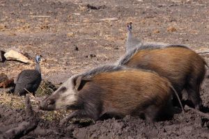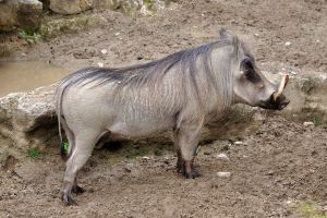 Scientific Name: Potamochoerus porcus Subspecies: Up to 18 recognised species, here described as one. Distribution: All of Africa south of the Sahara Desert, excepting the desert of Namibia. Habitat: High forest, their fringes and thick bush country, often near rivers. Frequents fields where they cause much damage. Description: A domestic pig-like animal, weighing around 100 kg and measuring...