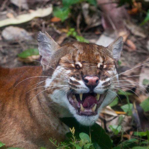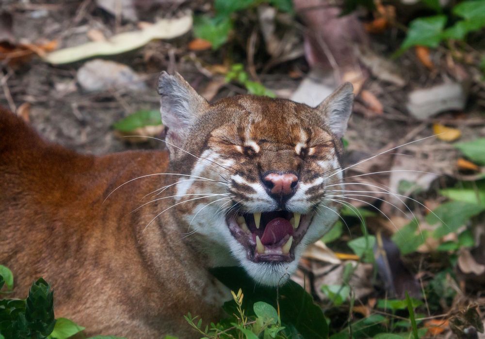 Description: Large wild cat weighing up to 11 kg. It reaches a total body length of 1,05 cm, without tail (55 cm). General colour rufous-grey with buff and dark grey facial stripes along the nose. Reminiscent of a small puma, but has longer legs.