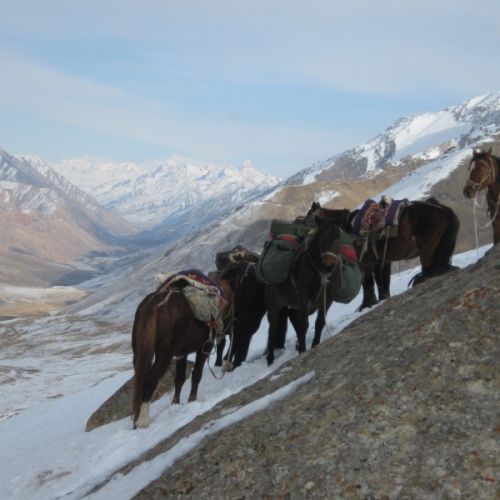 Together with your guide you leave base camp on horseback to search for the wanted species. In most cases these outings last for several days and during the hunt you overnight either in tents or mountain caves. Therefore a really good sleeping bag is a very important part of your equipment! You hunt up to an altitude of 4,500 meters above sea level, which of course in itself is a physical challenge. When a promising trophy has been spotted you begin an often long and strenuous stalk on foot. You must be prepared to shoot at distances of several hundred meters in difficult terrain – nobody said that it was easy. In return the efforts of the hunter will often be rewarded with trophies of more than 1 meter – in rare cases up to impressive 130 cm. The average of the Marco Polo is between 48” and 55”. And the nature and the scenery that forever will be imprinted in your memory cannot be described with words – it simply has to be seen and felt on your own body.
