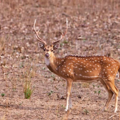 Description: Medium sized deer weighing up to 90 kg and measuring up to 95 cm over the shoulder. It may reach a total body length of 1.75 m without tail (15 cm). General colour rufous brown with white spots. The antlers are forked and have several points.