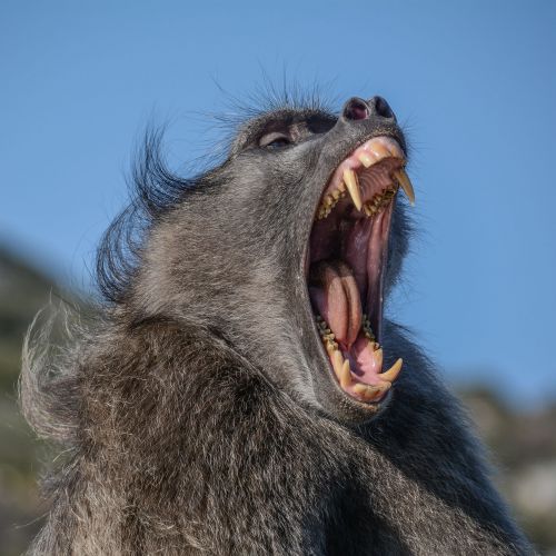 Description: The largest monkey, with adult males achieving a body length of up to 120cm and a body weight of 40kg. The tail is relatively short. Females and much smaller. All baboons have long, dog like muzzles with large canon teeth.