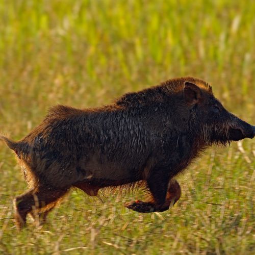 Description: New world pig, weighing up to 40 kg and measuring around 60 cm over the shoulder, reaching a total body length of around 1,20 m. General colour greyish brown, with a less marked collar than that of the Collared Peccary.