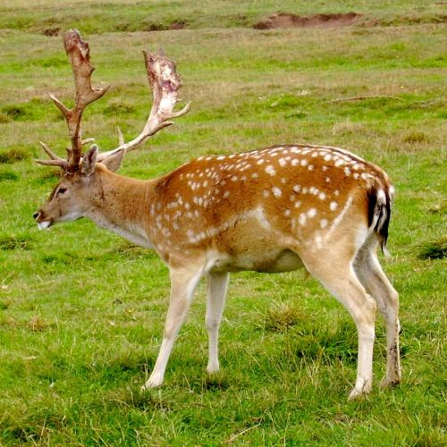 Description: Heavier built than the European Fallow Deer, this deer weighs up to 150 kg and measures up to 1,40 m over the shoulder. It reaches a total body length of 2,50 m without tail (30 cm). General colour reddish brown with white spots, like Dama dama. The antlers are compacted and less palmate than those of the European Fallow Deer.