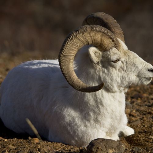 Description: Middle-sized wild sheep weighing around 120 kg and measuring up to1,05 m. over the shoulder, reaching a total body length of 1,55 m. The coat is almost pure white in the north over brown (Dall Sheep) to almost black in the south (Stone Sheep). A special colour variation belongs to the Fannin Sheep the coat of which is a mixture of that of the two mentioned subspecies.