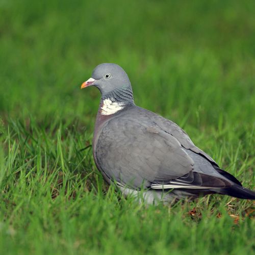 Description: Largest of the pigeons, identified by white neck fish and broad white wing bar. Generally grey above, pinkish below. In flight wingtips can be seen to be black, and the tail grey with black terminal band.