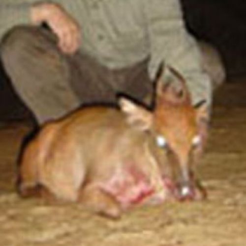 Description: Small antelope with a weight of around 15 kg. and a shoulder height of 40 - 50 cm. General colour lighter than the other Duikers. Has a blackish median band from the shoulder, broadening on the back and narrowing on the rump. Has the characteristic crest of hair between the horns. This species is also characteristic of having white underparts.