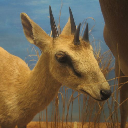 Description: Small antelope weighing up to 20 kg and measuring up to 65 cm over the shoulder. It may reach a total body length of 1,26 m without tail (15 cm). General colour greyish brown with paler underside. It is distinctive in having 4 horns, hence the name.