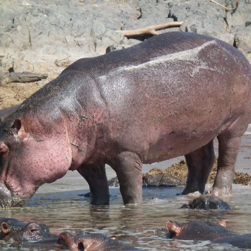 Description: Next to the elephant, the largest land mammal. Unmistakable. A huge, fat animal, with short legs, an enormous head with an extremely broad muzzle. It weights around 3,5 tonnes, and measures 1,5 meters over the shoulder. Skin nearly naked and forming folds on neck and sholders. Colour uniform brownish grey. The hippo has an enormous mouth with long tushes strongly curved, the lower ones growing straight forward, and the upper ones downward. These are used in fights with other hippos or as a defence against predators. The Hippo is very aggressive and kills more people every year than any other African mammal.