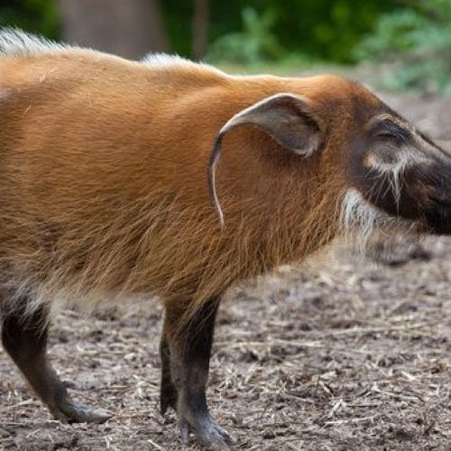 Beskrivelse: Red River Hog er en mellemstor vildsvineart med et karakteristisk rødligt pelsfarve og hvidlige striber på benene og hovedet. Hannerne vejer op til 80 kg, mens hunnerne er lidt mindre. Den har et markant hoved med lange, børsteagtige hår på toppen og på bagsiden af halsen, hvilket giver den et næsten mane-lignende udseende. Dens ansigt er smalt med en stærk, mørk snude. Det er et sky dyr, der ofte lever i små grupper og er mest aktiv ved skumring og om natten.