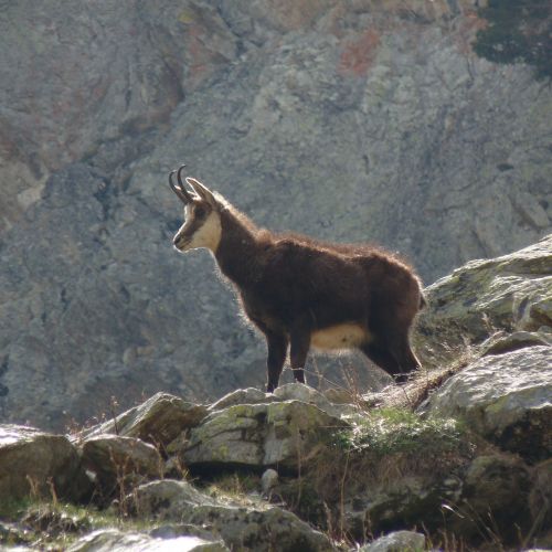 Description: Medium sized goat weighing up to 50 kg and measuring up to 85 cm over the shoulder. It reaches a total body length of 1,40 m. General colour reddish brown with black line along the spine in summer, black with black and white markings on face in winter. Both sexes have horns that are small compared to the size of the Chamois, those of the male being the largest. They are thin, upwards pointing and at their ends hook shaped.