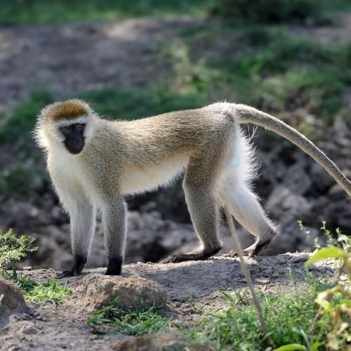 Description: Middle sized monkey, arms and legs much the same length and a with a long tail. Grizzled grey in colour with a black face fringed with white hairs. Males larger than females. Adult males have a body length of between 42 and 60cm and weigh between 4 - 8 kg. Adult females average between 30 and 50 cm in body length and weigh between 3.4 and 5.3 kg. They are similar in appearance to grivet/green monkeys