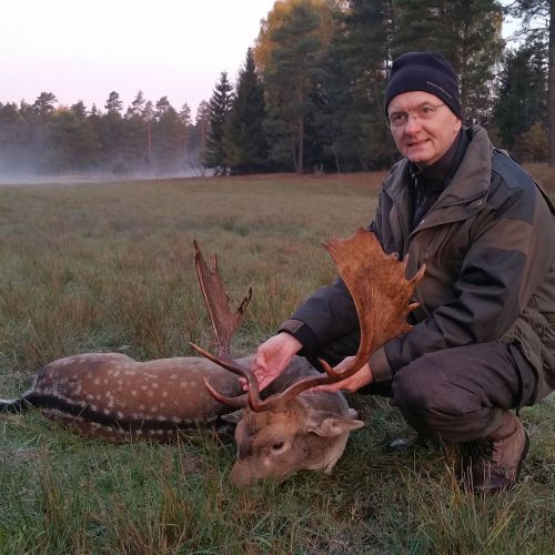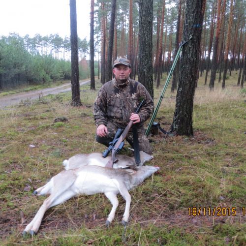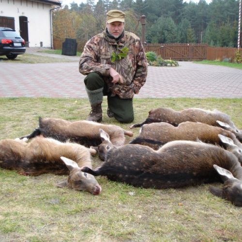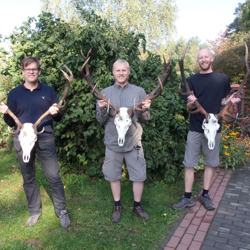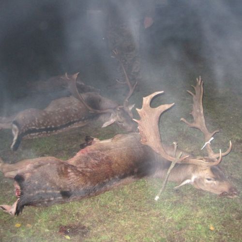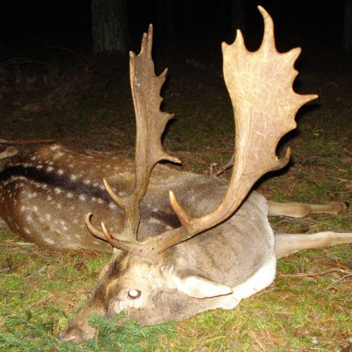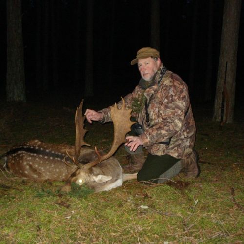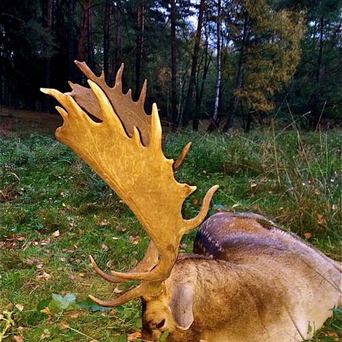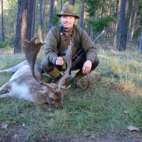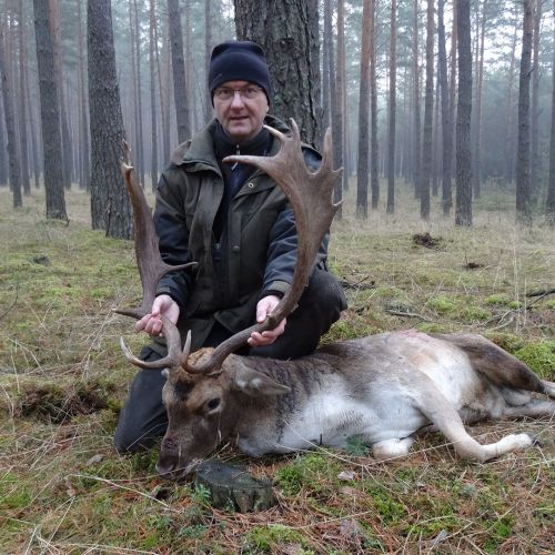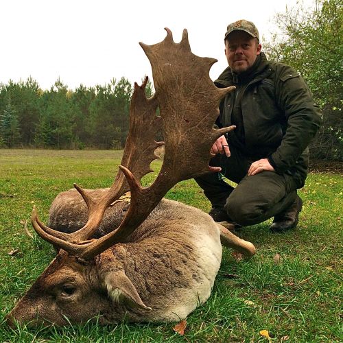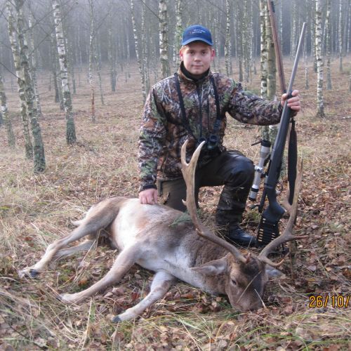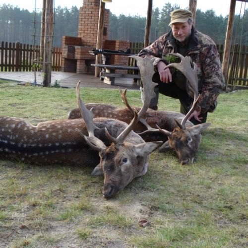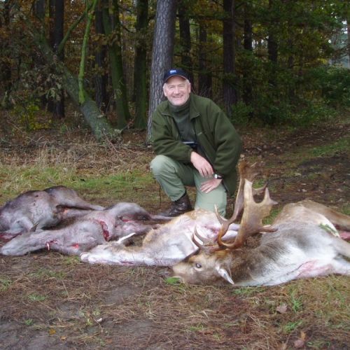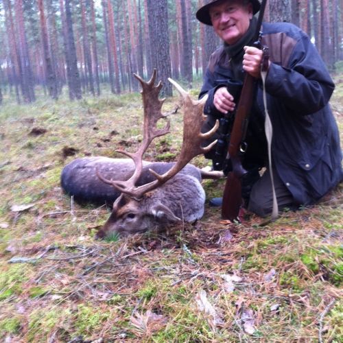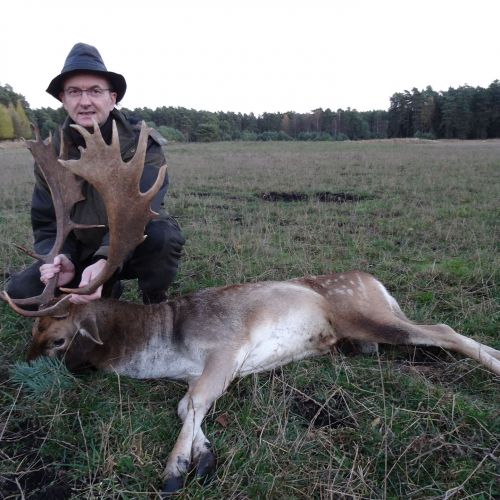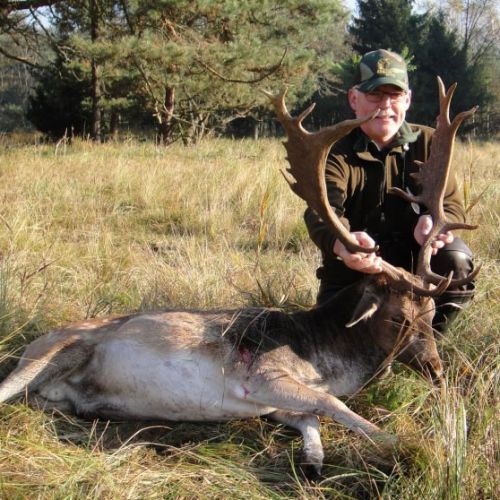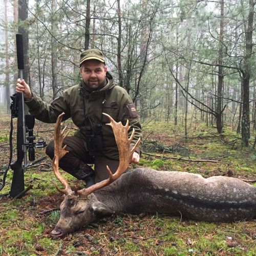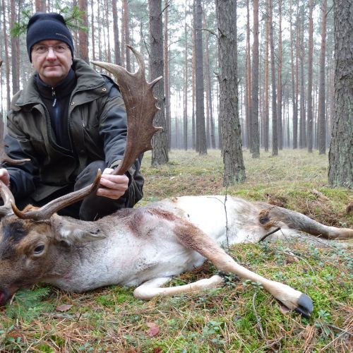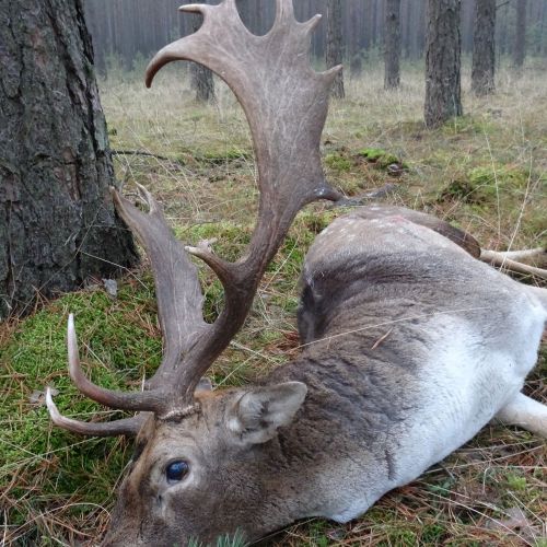 This district is home to Poland’s largest population of fallow deer, with an annual quota of around 270 individuals. Dąbrowa also has good populations of red deer, wild boar, but numbers of roe deer are limited. Around 8 roebucks are shot here annually, most of which produce trophies of under 250g net weight, but a few individuals of over 300g are also taken from here. The annual quota for red stags is 25 - by far the most of which have a trophy weight of 4 - 6 kg, although every year a few trophies of over 6 kg are shot here. Around 50 fallow buck are taken here annually, good, average sized Polish buck - with a few bucks approaching - or slightly above - 3kg trophy weight. There is a reasonable population of wild boar at Dąbrowa, which can be hunted on individual hunts throughout the season or during hind-stalking/small driven hunts in the autumn and winter.
