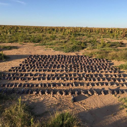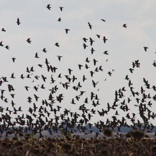 Pigeons arrive in thousands to feed in the fields full of ripe sunflowers. The season here stretches from February to the end of August. It is the experience of a lifetime to see so many pigeons coming from all directions and from every angle.