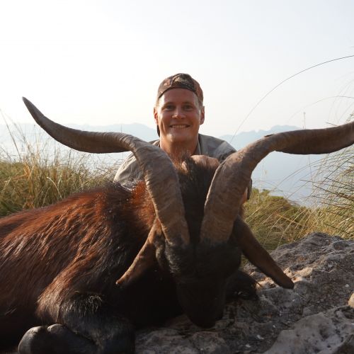 The coat of this wild goat is reddish brown, and the males sport a beard and large, spiral, rear facing horns. Occasionally the females also grow horns.