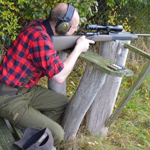 We were in luck! Behind the huge fenced garden of the guesthouse, there was a fine little 100 meter shooting range equipped with a homemade but very sturdy shooting bench. I quickly assembled the brand new rifle – it only took a few seconds – and I made a couple of crude paper targets with a ball pen on the back of some tax return slips from the bottom of the trunk. I knew that the gun makers at the Mauser factory had test-fired the rifle but I did not have a clue what ammunition they had used. I just hoped that the first shot with the Norma Oryx ammunition I had chosen for this hunt would land somewhere on the target so that I could start zeroing the scope properly.
