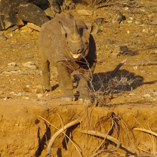 When we felt the breeze against the back of our heads, it was already too late. The hardly noticeable wind had turned to carry our scent directly to the black rhino bull at the bottom of the river. He blinked his beady little eyes raised his head and sniffed the wind. In the next second he exploded in furious rage.