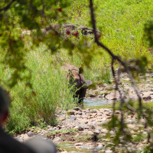 They spotted our heavy buddy on the opposite bank. He was browsing peacefully on dry bushes. We stopped to take photos of the big fellow. He was slowly moving towards us and soon he was within 50 meters. We quietly observed and had already chosen our personal trees should the situation suddenly escalate.