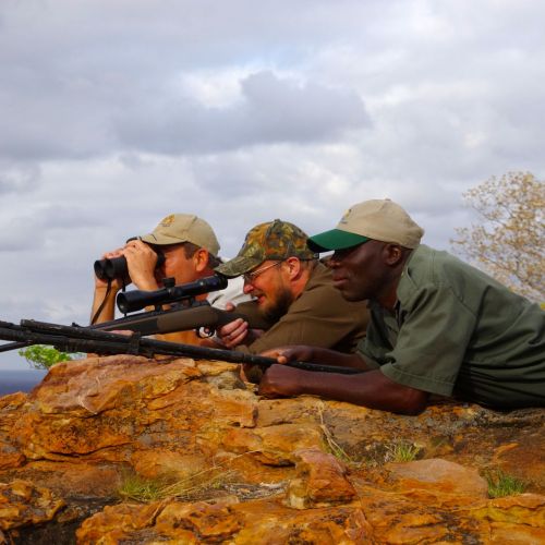 We started our first hunting day with a long walk along the Nzehelele River a tributary to the mighty Limpopo River that forms the areas boundary to Zimbabwe. The landscape was wild and impressive. So was the game populations. Along the deep and rocky riverbed, we saw plenty of waterbuck, bushbuck, kudu, nyala and bush pig. Big crocodiles patrolled the shallow water and a grumpy old black rhino bull demanded our constant attention.