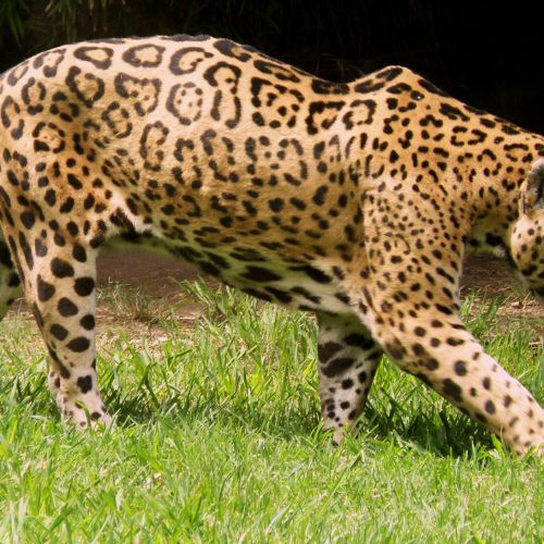Description: The Jaguar weighs around 160 kg, and measures up to 75 cm over the shoulder, reaching a length without tail of 2,40 meters. Heavy built cat with golden fur with black spots. The spots on the flanks and the back are rosettes with a small black dot in the middle.
