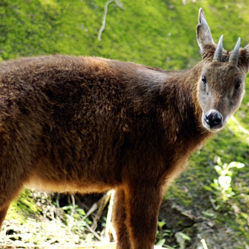 Description: Antelope-like animal related to the Chamois. It weighs up to 100 kg and measures up to 1,05 m over the shoulder, reaching a total body length of 1,40 m without tail (12 cm). General colour dark chocolate brown with reddish brown legs from the knees and down. On the neck the hairs are almost mane-like. The horns are small, heavily built, backwards pointing.