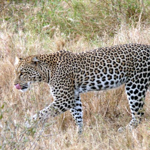 Description: Unmistakable. A big cat, with very elegant shape reaching a weight of 60 - 90 kg and a shoulder height of around 70 cm. The body is long with comparatively short, stout legs. Coat dense and soft, marked with numerous black spots, on a buff or yellowish-tawny ground colour. Tail long and spotted. Leopards hunt entirely by night, springing on their prey either from a hide in a tree or from on a rock. The victiom is generally seized by the neck and the backbone broken at this level. If the leopard does not finish its prey, it may return up to several times to the spot, untill the prey is eaten, or it may drag the victim into a tree to hide it.
