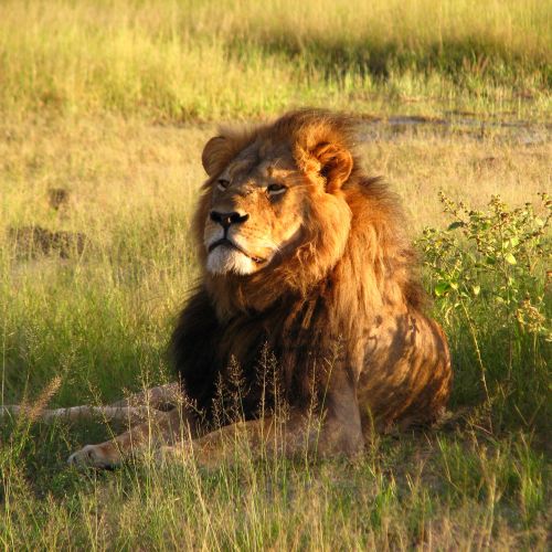 Description: Large cat with characteristic features weighing up to 250 kg. It measures up to 80-100 cm over the shoulder. General colour ocre to silvery grey. The mane on the male is variable in colour, from almost black to light ocre. The mane may even be almost non-existing in some males. The tail is long and has a tassel at its point (unique feature amongst the Felidae).
