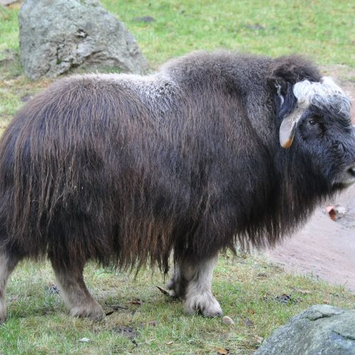 Description: Largest member of the sheep family, the Musk Ox weighs up to 410 kg and measuring up to 1,50 m over the shoulder. It reaches a total body length of 2,50 m. General colour brown, the hairs of the coat being very long and silky. The horns are broad and flat, pointing downwards and then forwards.