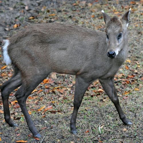 Description: A small deer related to the Muntjac, only slightly larger. It weighs up to 25 kg and measures up to 70 cm over the shoulder, reaching a total body length of 1,50 m without tail (12 cm). General colour grey-brown with whitish rump. It has some light grey markings on the face. The forehead is almost black.