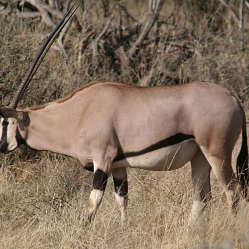 Description: Large antelope with very compact body and a well defined pattern on head and body so typical for the Oryx's. Body sandy fawn with a black spinal stripe. The horns are nearly straight with a slight backward curve, very long and heavily ridged, almost parallel.