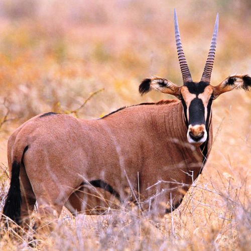 Description: Large antilope (180-200kg) with a compact body. The colour is grey-fawn with a well defined pattern on head and body so typical of the Oryx antelopes, and its ears bear a very distinctive tuft of long black hairs. The horns are heavier than those of Beisa Oryx.