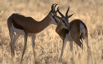 Description: The tree species will be described as one as the difference between them is negligent: Middlesized antelope that reaches a weight of 120 kg and a shoulder height of 90 - 100 cm. General colour either bright chestnut fulvous with white markings on head and neck. Black Lechwe is more blackish brown in colour on the neck, back and sides. Kafue Lechwe has dark shoulder patches. The horns are reminiscent of Buffon Kobens, but are somewhat heavier and longer.