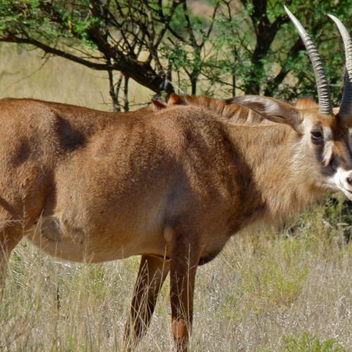 Description: Large antelope with a shoulderheight of ca. 150 cm and a weight of upt to 300 kg. General colour from dark rufous to light reddish fawn (roan) with contrasted black and white markings on head. The horns are similar to those of the Sable Antelope, but smaller. The Roan is easily recognised by its very long, pointed ears, tufted at their tip.