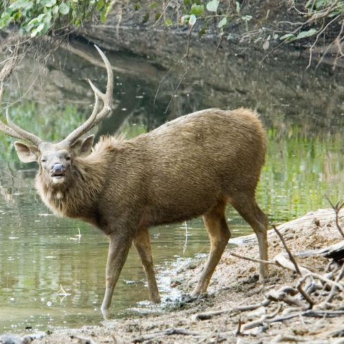 Description: Very large deer weighing up to 350 kg and measuring up to 1.50 m over the shoulder. It may reach a total body length of 2,50 m without tail (20 cm). General colour dark brown. The antlers are large and heavy with a maximum of 6 points.
