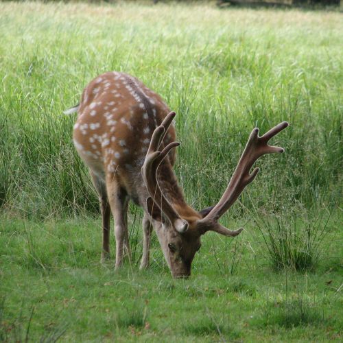 Description: Medium sized deer weighing up to 130 kg and measuring up to 1,15 m over the shoulder. It may reach a total body length of 1,90 m. General colour rufous brown with white spots in summer. The stags often appear almost blackish as they like to wallow in dirt and mud. The tail is of medium length set against a white rump edged with black. The antlers are forked and have a maximum of 8 points.