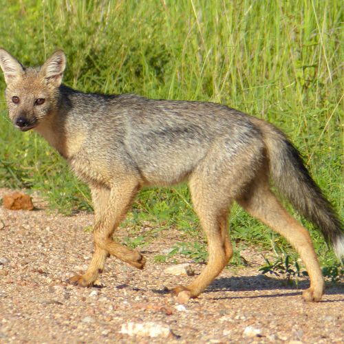 Description: Smaller fox like animalt hat weighs about 10 kg. and measures 45 cm above the shoulders. The coat color is brown with bright chest and white tip of tail. Along the side is has a dark stripe.