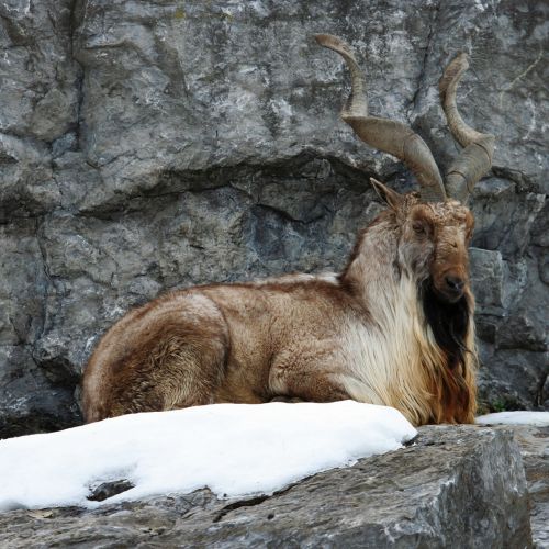 Description: Large wild goat with characteristic spirally wound horns. It weighs up to 110 kg and measures up to 1 meter over the shoulder. The coat is long and wooly and mane-like. The males have also a beard.
