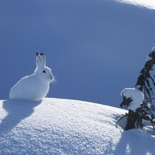 Description: Arctic hares are medium-sized mammals specialized for life in cold climates. They have a seasonal coat that changes from brown or gray tones in the summer to white in the winter to camouflage in the snow. Their large hind feet help them move easily over the snow.