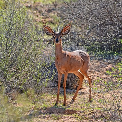 Description: Small antelope weighing 10 - 15 kg with a shoulder height normally not above 60 cm. The Steenbok i uniform bright rufous fawn with white markings over the eyes and on the throat. The horns are straight and very sharp, smooth, slightly curved forwards and having narrow ridges.