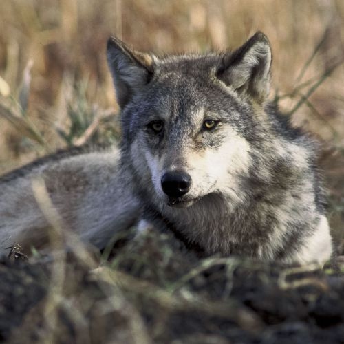 Description: Reminiscent of a large Alsatian dog, the Wolf weighs around 90 kg, and measures up to 100 cm over the shoulder. The legs, however, are longer and thinner, the chest shallower, the head broader and the neck thicker. The nose is more pointed and the ears stand up straight. The pelage is grey to greyish fawn with brown-reddish colour on the back and the head/ears.