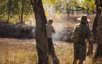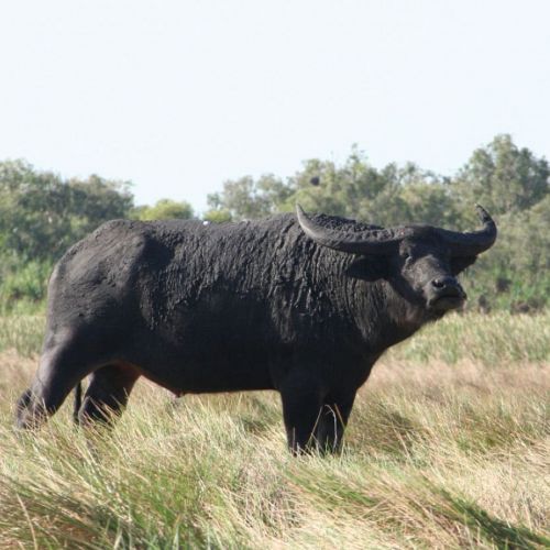 Description: Large wild cattle weighing up to 900 kg and measuring up to 1,80 m over the shoulder. It may reach a total body length of 3 meters without tail (1 m). General colour greyish brown, often seen covered in mud. The horns are long, outwards projecting and upwards pointing towards the tip. In many areas domesticated.